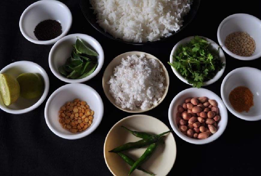 - The seasoning of the rice is lightly friend in oil and includes black mustard seeds, chilies, curry leaves for the distinct flavor and a common addition in most of the dishes from south India, asfoetida, urad and chana dal in small quantities, making the dish a beautiful blending of different ingredients.